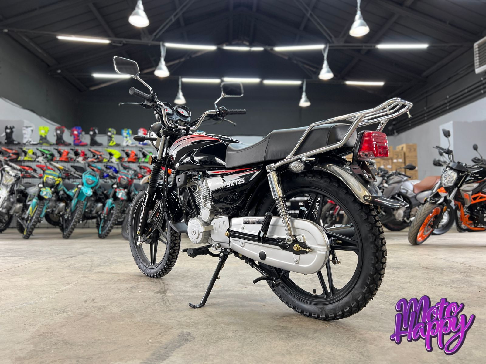 Мотоцикл комплектуется всем необходимым оборудованием для комфортной и безопасной эксплуатации на городских и проселочных дорогах: приборная панель, зеркала, световое оборудование, электростартер (двигатель также можно завести при помощи кик-стартера), защитный кожух цепи, складные подножки пассажира и крепкий багажник. Regulmoto SK-125 можно рекомендовать как начинающим мотолюбителям, так и райдерам с опытом в качестве надежного транспортного средства на каждый день.