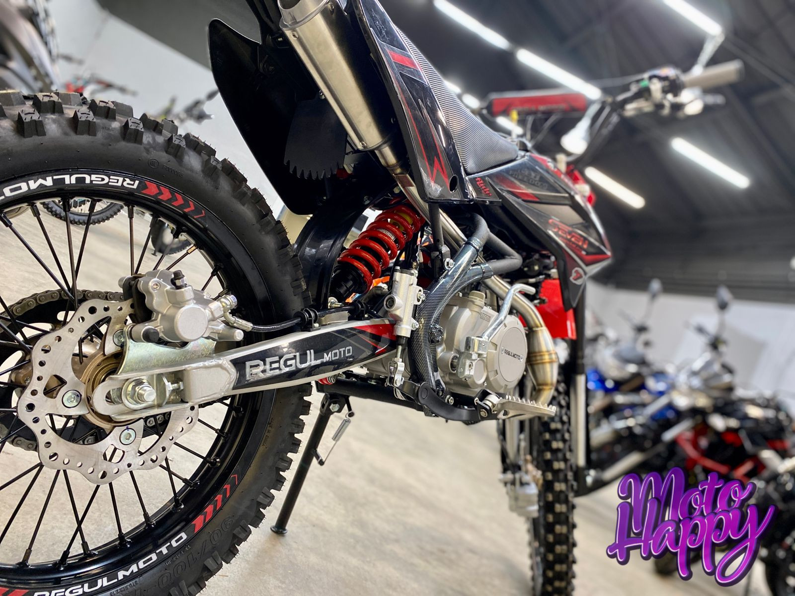 Подвеска обновленной модели была доработана для наилучшей производительности в различных условиях использования питбайка; используются амортизаторы KKE. Колеса собраны на усиленных алюминиевых дисках с 36-ю спицами, в стоке на обоих колесах стоят буксаторы и качественные внедорожные покрышки. Среди других комплектующих и компонентов Regulmoto SEVEN MEDALIST PRO следует отметить такие моменты:
