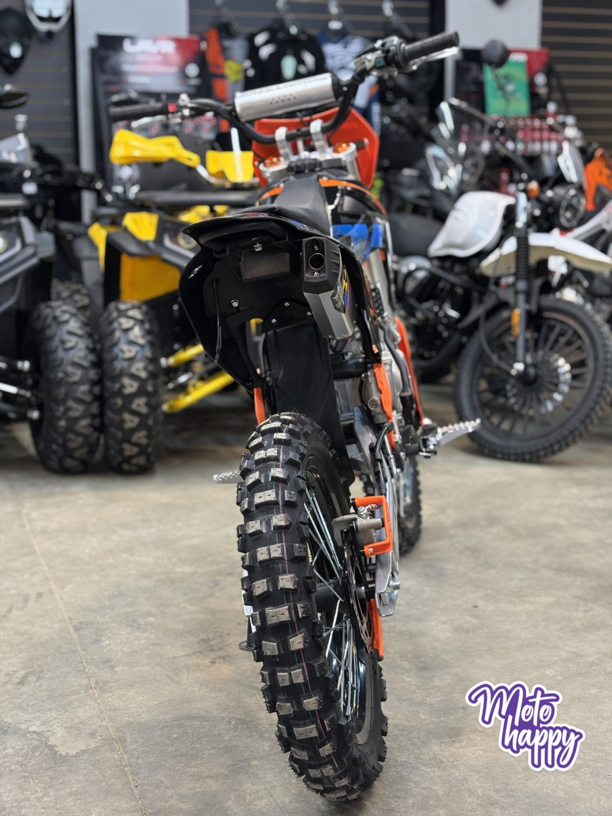Сердце модели - мощный 140-кубовый двигатель YX с воздушно-масляной системой охлаждения, способный выдавать 12 л.с. и выдерживать интенсивные нагрузки. При этом питбайк остаётся невероятно лёгким - всего 83 кг, что в паре с продуманной геометрией даёт феноменальную маневренность. Защита рамы, тормозов и суппорта уже входят в базовую комплектацию.