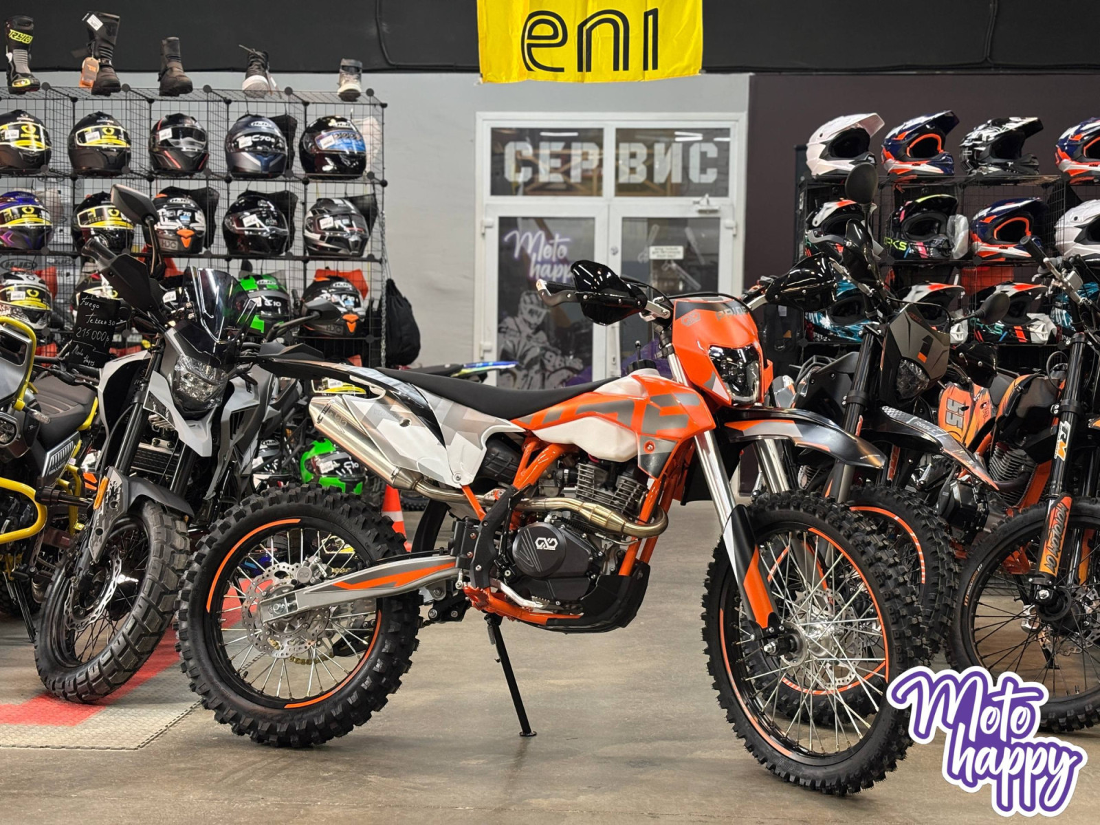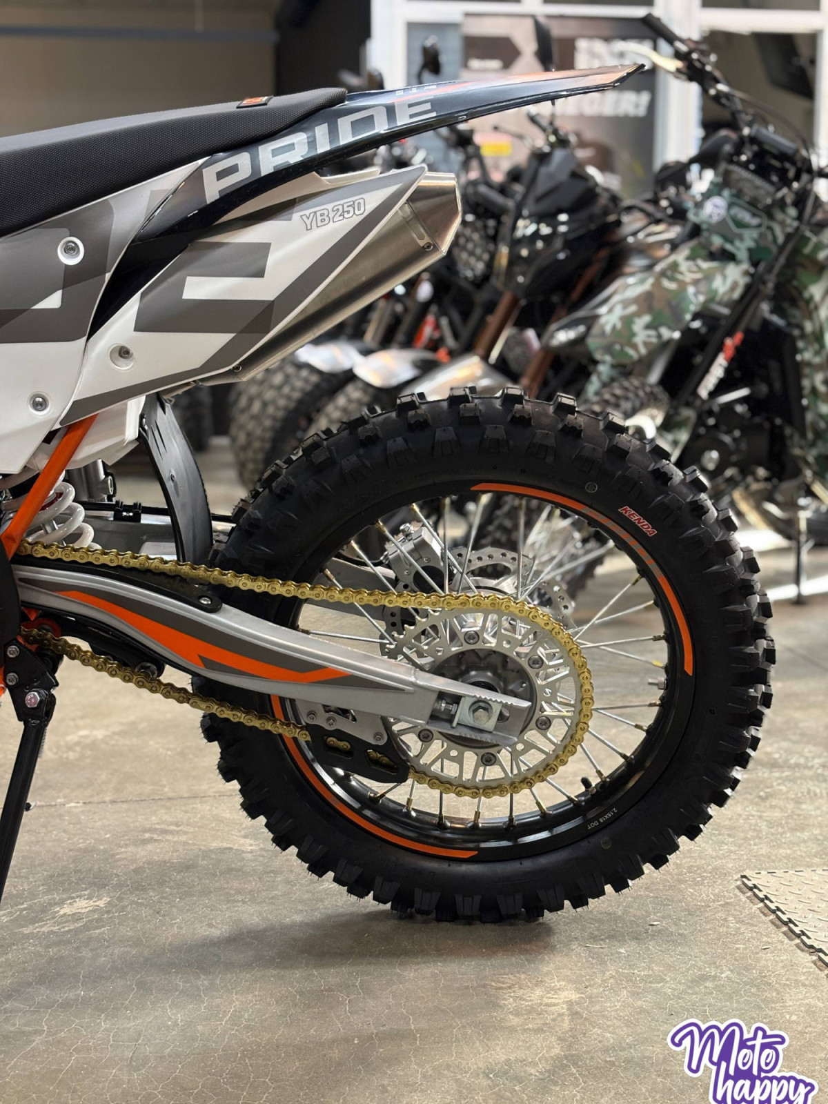 Ходовая часть: "Жирная" резина KENDA (80/100-21, 120/90-18), мощные двухпоршневые тормоза и яркая LED-фара с 5 линзами.
