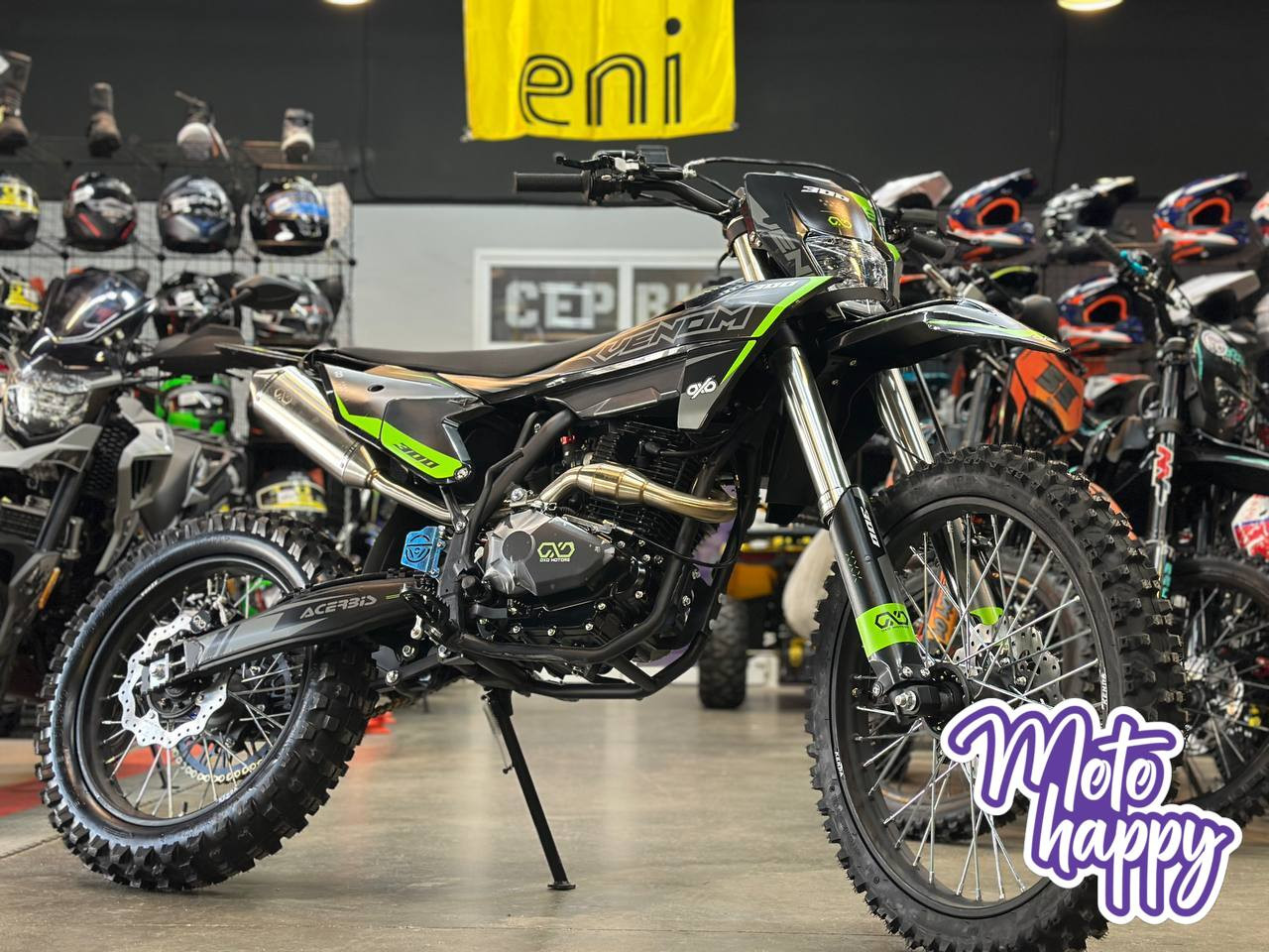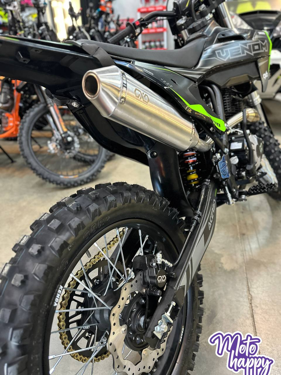 В основе — легкая и прочная хром-молибденовая рама и прогрессивная подвеска с перевернутой вилкой. Мотоцикл обут в "жирную" резину KENDA (80/100-21 и 120/100-18), которая отлично держит песок и грязь. Сухой вес 118 кг делает его маневренным и послушным. VENOM 300 — это мощный рабочий инструмент без лишних компромиссов.