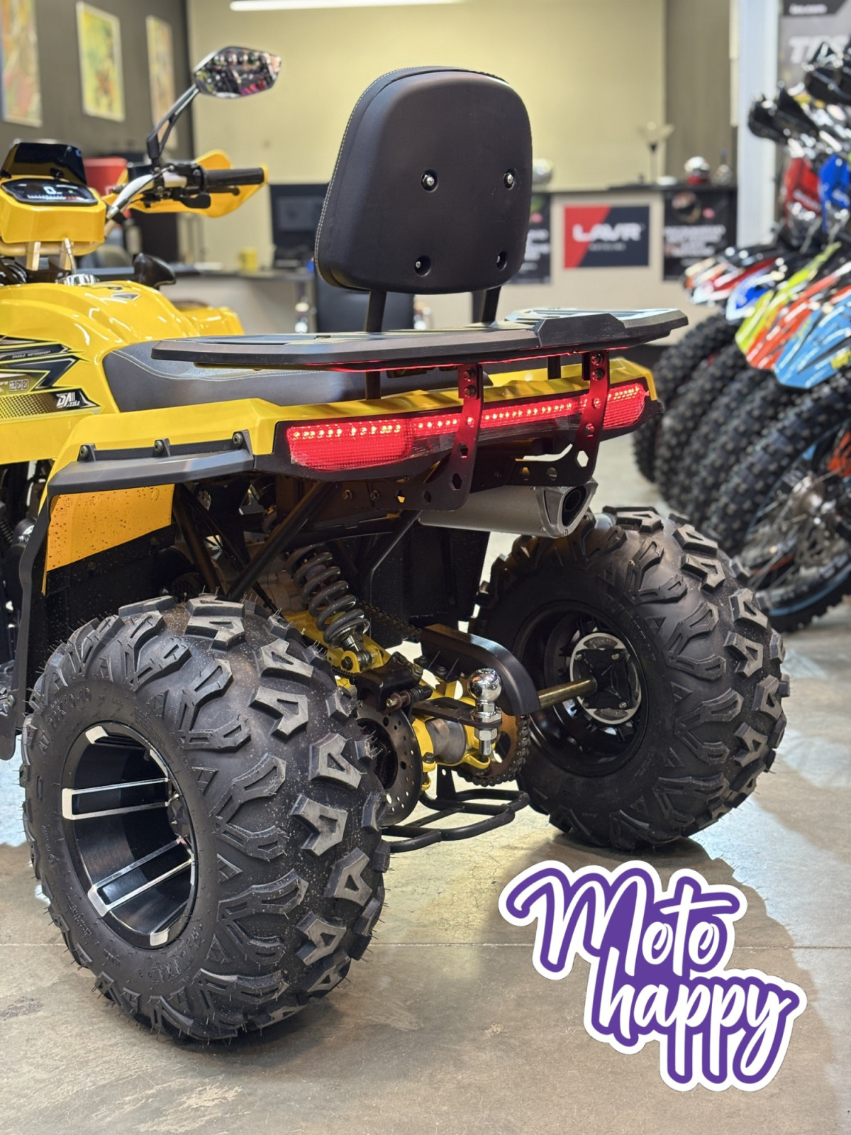 Отличительной особенностью данного квадроцикла является не только хорошее качество комплектующих, но и современный дизайн, основанный на новых тенденциях современной квадротехники. За вполне приемлемые деньги вы получаете яркую оптику на Led огнях, информативную ж/к панель приборов, двухместное седло и два багажника.