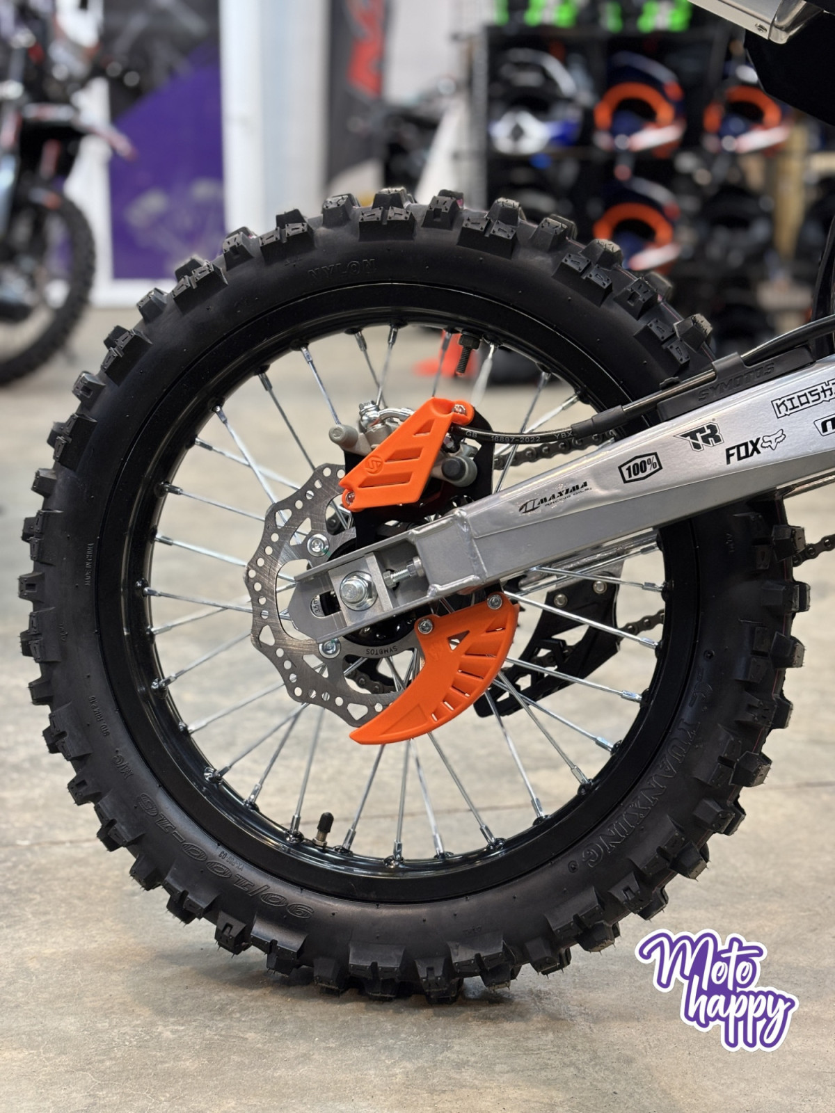 Сердце модели - мощный 140-кубовый двигатель YX с воздушно-масляной системой охлаждения, способный выдавать 12 л.с. и выдерживать интенсивные нагрузки. При этом питбайк остаётся невероятно лёгким - всего 83 кг, что в паре с продуманной геометрией даёт феноменальную маневренность. Защита рамы, тормозов и суппорта уже входят в базовую комплектацию.